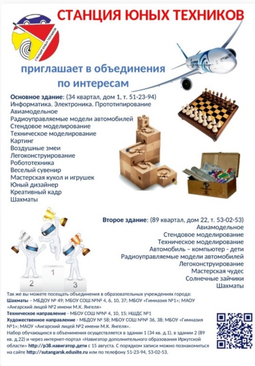МБУДО «Станция юных техников» ведет запись детей с 6 до 18 лет в объединения по интересам на летний период и на новый учебный год. С 2021-2022 учебного года введен новый порядок записи детей в учреждения дополнительного образования (Распоряжение Правительства Иркутской области №460-рп от 04.07.2019 «О внедрении целевой модели развития региональной системы дополнительного образования в Иркутской области»).